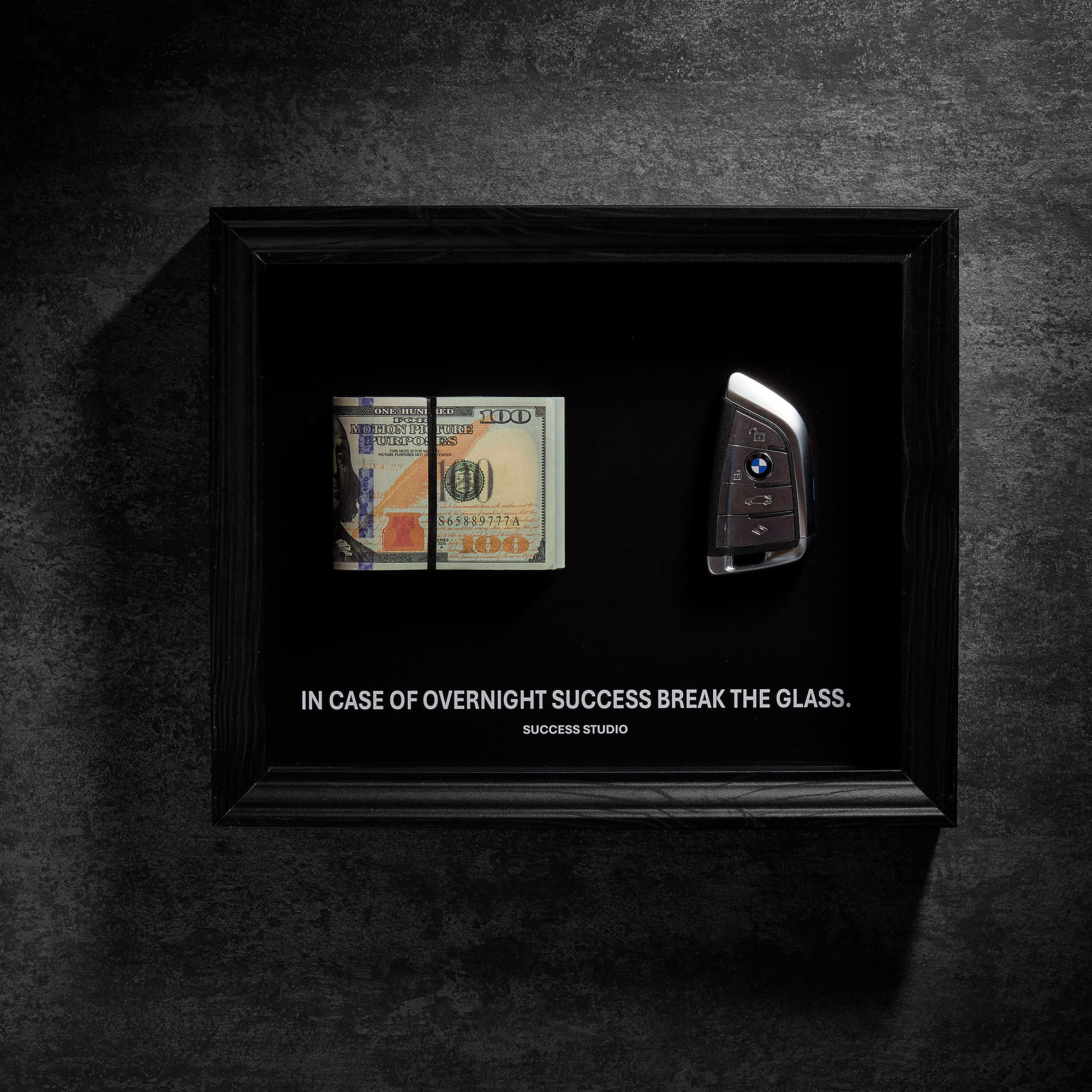 מסגרת יוקרתית ומעוררת השראה, עם מפתח BMW יוקרתי לצד שטרות דולרים מעוצבים. היצירה משלבת כוח, הצלחה ופריצת גבולות – תזכורת יומיומית לכך שהחלום שלך קרוב מתמיד, ושאתה בדרך הנכונה להגשים אותו.